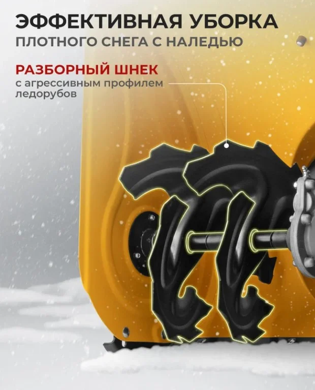Снегоуборщик относится к самоходному типу с двухступенчатой системой забора снега.