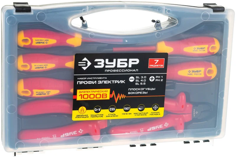 Набор: диэлектрический, высоковольтный губцевый инструмент, до 1000В, 7шт Зубр ЭКСПЕРТ 2214-H7_z01 - комплект электроизоляционного монтажно-демонтажного инструмента для проведения работ под напряжением до 1000 Вольт.