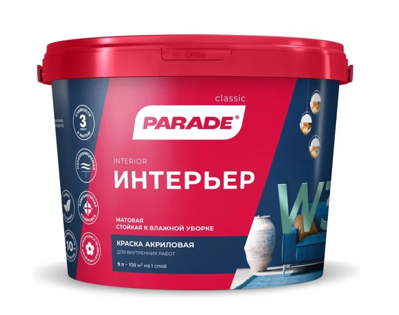 PARADE W3 акриловая матовая краска для стен и потолков внутри помещений. Гарантирует влагостойкое матовое покрытие, которое устойчиво к мокрому истиранию и выдерживает влажную уборку. Имеет высокие декоративные свойства, отличную укрывистость и прочное сцепление с основанием. Сертифицирована для использования в детских и медицинских учреждениях, может быть заколерована водными красителями. При соблюдении технологии обеспечивает долговечность интерьерного покрытия.