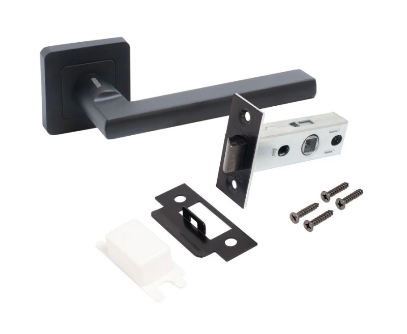 Комплект: ручка на квадратной накладке и защелка без фиксации.Материал ручек — алюминиевый сплав, защелки - сталь. Покрытие - полимерная краска. Комплектуются винтовыми стяжками и шурупами. Длина разрезного квадрата - 95мм. Для деревянных дверей, толщиной 35-40 мм.