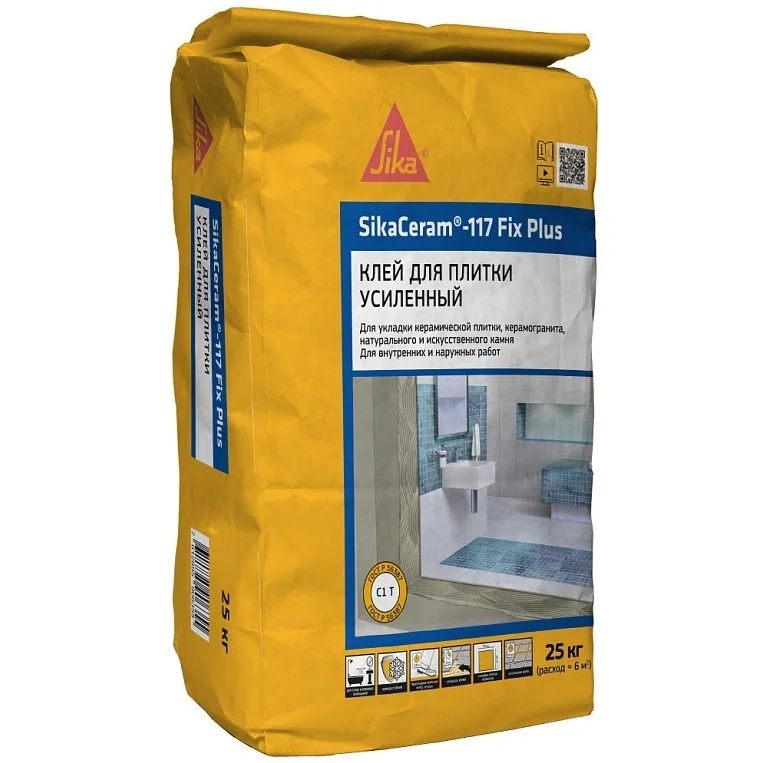 SikaCeram-117 Fix Plus предназначен для внутренних и наружных работ по облицовке стен и полов плиткой размером до 60×60 см и подходит для облицовки фасадов, цоколей и входных групп; облицовки стен и полов в помещениях с постоянно высокой влажностью. Рекомендованные типы плитки: керамическая плитка двойного или одинарного обжига; керамогранит; натуральный и искусственный камень (нечувствительный к влаге). Рекомендованные типы оснований: бетон, ячеистый бетон, кирпич; цементные и цементно-известковые штукатурки; цементные стяжки; цементные гидроизоляционные составы (например, SikaSeal-172); основания на гипсовом или смешанном вяжущем (обязательно грунтование).