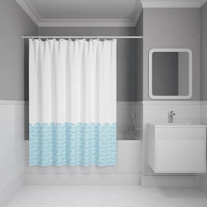 Текстильная штора для ванной белого цвета с голубым принтом в виде волн в средиземноморском стиле.