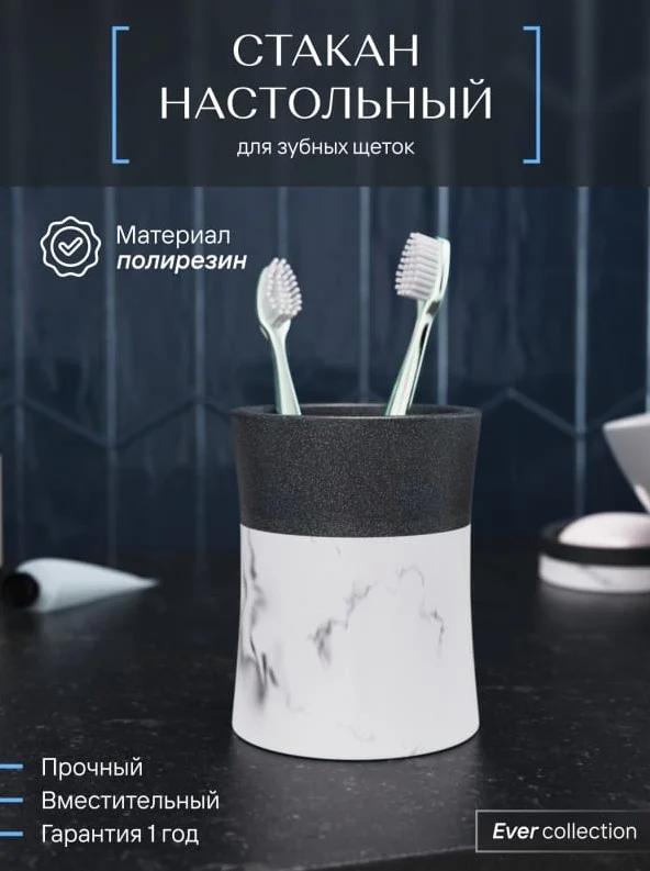 Настольный стакан EVER, произведенный компанией Fora, выполнен из полирезина — экологичного, долговечного и влагоустойчивого материала. Этот аксессуар предназначен для размещения зубных щеток, зубной пасты и бритв. Благодаря своему стильному дизайну изделие прекрасно дополняет современный интерьер ванной комнаты.
