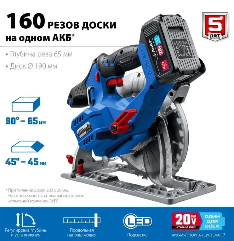 Бесщеточная циркулярная пила ЗУБР Профессионал 20В CPB-190-41 предназначена для пиления дерева, древесностружечных плит (кроме асбестосодержащих) и подобных материалов, а также пластмасс и алюминиевых профилей при установке соответствующего пильного диска.