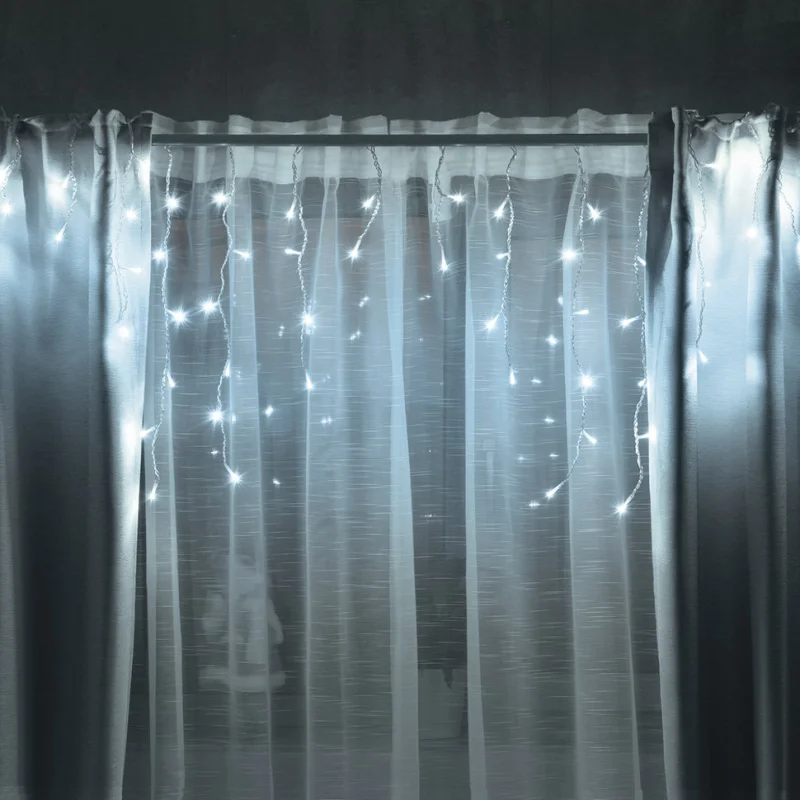 Размер гирлянды 200*60см, длина провода 300 см. Кол-во светодиодов 48. Кол-во нитей 12 шт. Цвет свечения холодный. Кол-во режимов свечения 8. Цвет провода прозрачный. Степень защиты IP 20. Мощность 2,88W.