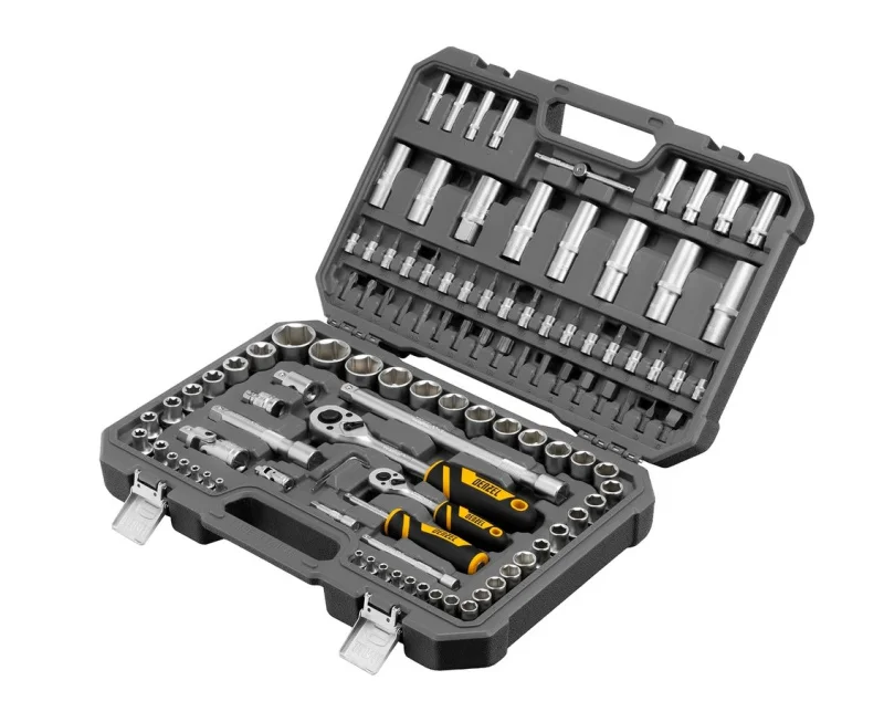Набор инструментов состоит из 109 предметов из стали CrV и S2, с присоединительными квадратами 1/4, 1/2, и упакован во вместительный усиленный кейс собственной разработки с антивандальным покрытием. В комплект поставки входят инструменты и оснастка для монтажа и демонтажа резьбовых соединений. Набор предназначен для профессионального использования в автомастерской, будет полезен для решения бытовых вопросов.