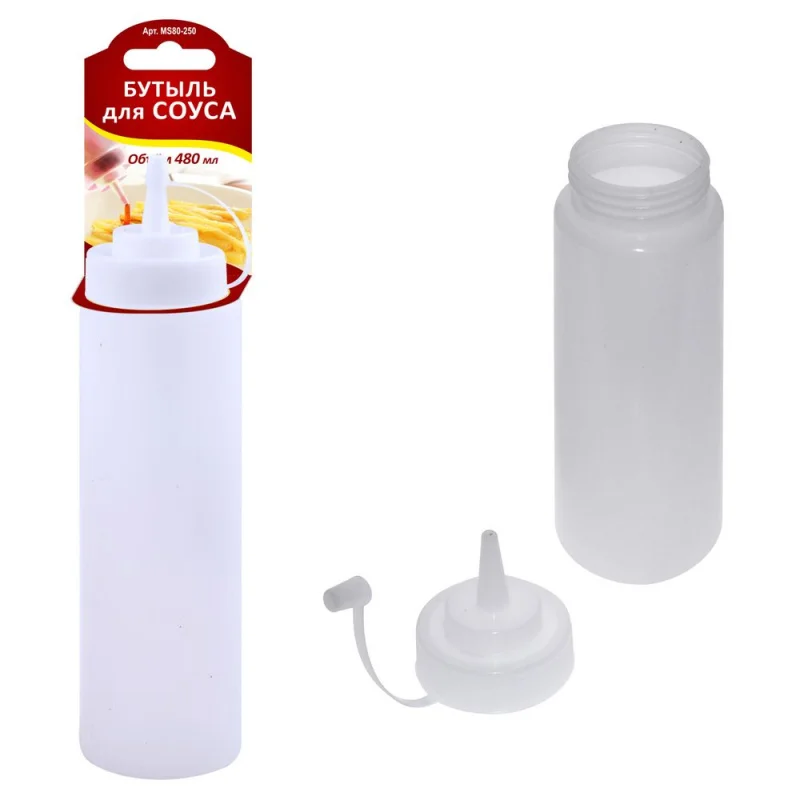Удобная емкость для хранения соусов в холодильнике. Имеет клапан, закрывающий бутыль, во избежание попадания воздуха и порчи содержимого. Благодаря тонкому носику, бутыль можно использовать для жидкого теста при приготовлении ажурных блинчиков и оладий, а также в качестве декоратора при украшении выпечки кремом или глазурью.