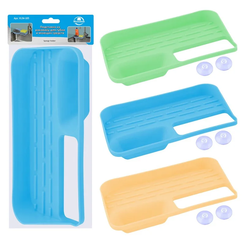 Подставка для губки и моющих средств организует пространство на кухне и в ванной комнате. На данной подставке можно разместить сразу несколько предметов. Для салфетки или тряпки предусмотрена специальная перекладина. В одном отделении есть отверстие, сквозь которое стекает лишняя влага.