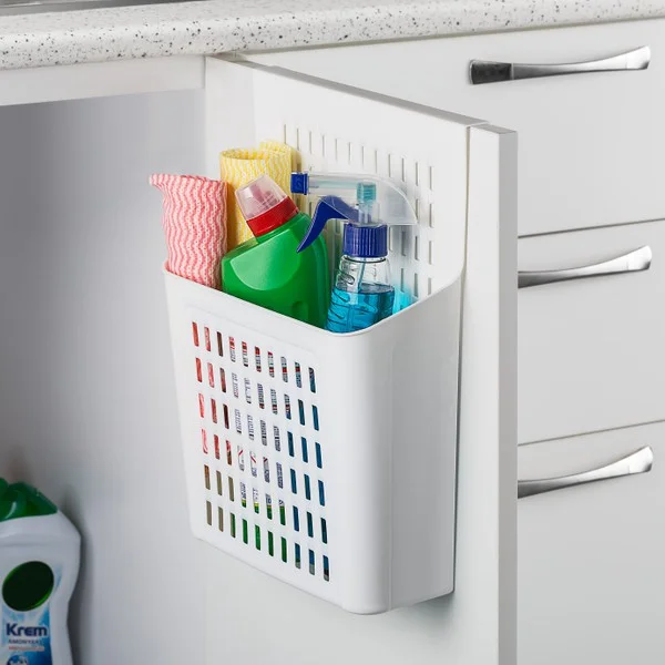 Подвесной пластиковый органайзер отличается своей практичностью. На кухне он идеально подходит для размещения столовых приборов, чистящих средств, бутылок, полотенец, пакетов для мусора, тряпок, губок и прочих хозяйственных мелочей. В ванной комнате его можно использовать для хранения как чистого, так и грязного белья.