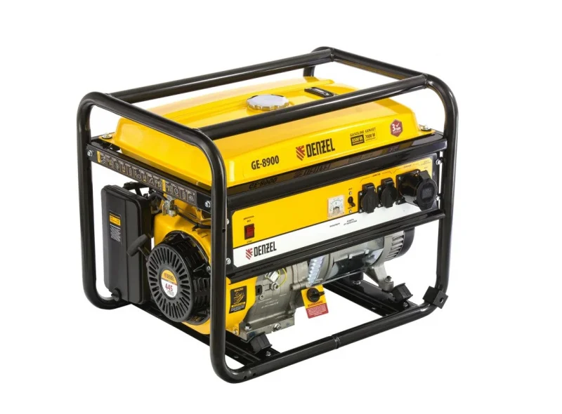 Бензиновый генератор Denzel GE 8900 94639, 220 В / 50 Гц, с баком на 25 л и ручным стартом, вырабатывает 8,5 кВт и способен обеспечить электричеством большой загородный дом, магазин или строительную площадку. Можно запитать сразу несколько потребителей, например, обогреватель или кондиционер, насос и электроинструменты. Силовая розетка позволяет подключать оборудование высокой мощности. Полного бака хватает на 7,8 ч работы без дозаправки.ПреимуществаБыстрый старт — автоматический декомпрессор облегчает запуск и снижает нагрузку на стартер.Надежность — двигатель Long Life Series с чугунной гильзой, стальными распредвалом, коленвалом и толкателями клапанов, а также альтернатором с медной обмоткой рассчитан на длительное использование.Высококачественные комплектующие — карбюратор YINBA/GUOI и свеча зажигания BOSCH продлевают срок службы двигателя.Продуманная конструкция — балансировочный вал снижает уровень вибраций, что увеличивает ресурс подшипников коленвала.Высокое качество сборки — сопрягаемые поверхности двигателя проходят инструментальный контроль.Безопасность — общая защита альтернатора и силовых клемм от перегрузки и короткого замыкания, а также отдельные предохранители для розеток предотвращают выход генератора из строя.Возможность подключения чувствительной техники — встроенный блок AVR нивелирует скачки напряжения.Защита поршневой группы — специальный датчик препятствует запуску генератора с низким уровнем масла в картере.Индикатор уровня топлива — можно отслеживать количество бензина и вовремя наполнять бак.Контроль параметров работы — вольтметр на панели управления отображает напряжение в системе.Надежная конструкция — усиленная рама из труб диаметром 32 мм с толщиной стенок 1,5 мм защищает генератор от повреждений.Удобное перемещение — крепления на раме позволяют установить ручки и колеса (приобретаются отдельно).Подтвержденное качество — гарантия на заводской брак действует 3 года.