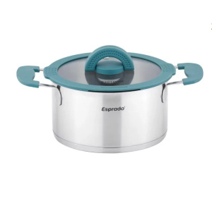 Кастрюля из нержавеющей стали 304 (Cr:18/ Ni:8) с крышкой из термостойкого стекла? c силиконовым ободом с паровыпуском в ободе и двумя сливами. Складной кноб из нейлона. логотип черного цвета на стекле. стальные ручки с силиконом на корпусе (Pantone 7475C). . Крышка с отверстием для выпуска пара и силиконовым ободом с двумя сливами. Размер:20*10.5 см (3.2 л). Толщина стенок: 0.6 мм . Паяное дно: 0.6 мм #304. 3.5 мм алюминий. 0.5 мм сталь марки 430 для индукционного дна. Прямая форма. Плоская стеклянная крышка с силиконовым ободом с паровыпуском в ободе и двумя сливами (Pantone 7475C). Отметка литража для точного соблюдения рецепта. Матовая полировка внутри и снаружи . Выгравированный логотип на крышке. на теле и на дне изделия. Результаты испытаний в ПММ: 50 циклов при 55-60 ° С. Можно использовать в духовке до 180 ° С.