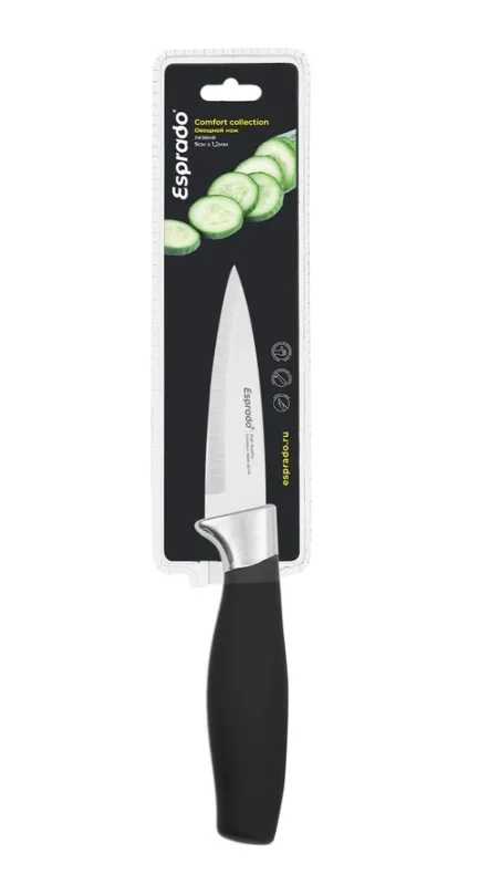 Овощной нож 9 см Толщина лезвия 1.2мм. длина лезвия 9см. Материал- нерж.сталь 2Cr14. твердость лезвия по шкале Роквелла: 52-55 HRC. обработка лезвия: матовая полировка. ручка –черного цвета. Термопластичная резина + покрытие soft touch.
