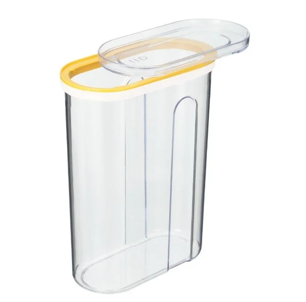 Крышка-слайдер выполнена по би-компонентной технологии. Внешний край крышки из эластомера плотно примыкает к корпусу и не пропускает влагу и запахи. Крышка-слайдер проста в использовании, просто сдвиньте верхнюю прозрачную часть по направлению стрелки, а для закрытия, сдвиньте в обратном направлении. Через оптимальный размер отверстия удобно насыпать как мелкие, так и крупные сыпучие продукты. Специальные углубления на корпусе позволяют комфортно удерживать емкость в руках. Через прозрачный корпус и крышку хорошо видно содержимое и его количество. И не важно, где стоят ёмкости, на полке навесного шкафа или в выдвижном ящике. Конструкция крышки позволяет устойчиво ставить ёмкости один на другой для эффективного использования пространства.