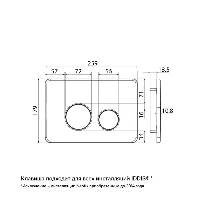 Клавиша IDDIS® Unisteel составит базовый комплект с современной подвесной сантехникой – изделие совместимо со всеми моделями инсталляций IDDIS®. В изделии ничего лишнего: только минималистичный дизайн, брутальная фактура и металлический блеск. Плоская и эстетичная клавиша смыва займет пространство размером не более ежедневника (25,9 на 17,9 см). Она легко монтируется и снимается для удобного доступа к крану открытия-закрытия воды и обслуживания арматуры. Для данной модели доступно несколько цветовых решений. • Клавиша смыва IDDIS® изготовлена из качественной нержавеющей стали, которая не боится ни бытовой химии, ни царапин. • Технология двухрежимного смыва (малым или большим объемом) обеспечивает ощутимую экономию потребления воды