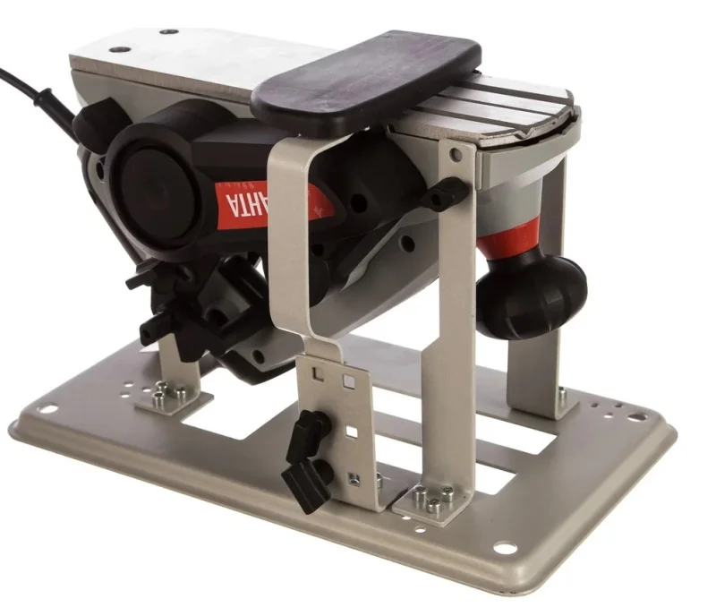Инструмент выполнен в пластиковом корпусе с отводом стружки вправо. Его можно подключить к пылесосу или пылесборнику для снижения запыленности помещения. Электрический рубанок весит 3 кг, это позволяет использовать его как ручной электроинструмент. Прорезиненные рукоятки облегчают его удержание и управление. Также в комплект входит станина для стационарного монтажа рубанка на рабочем столе.