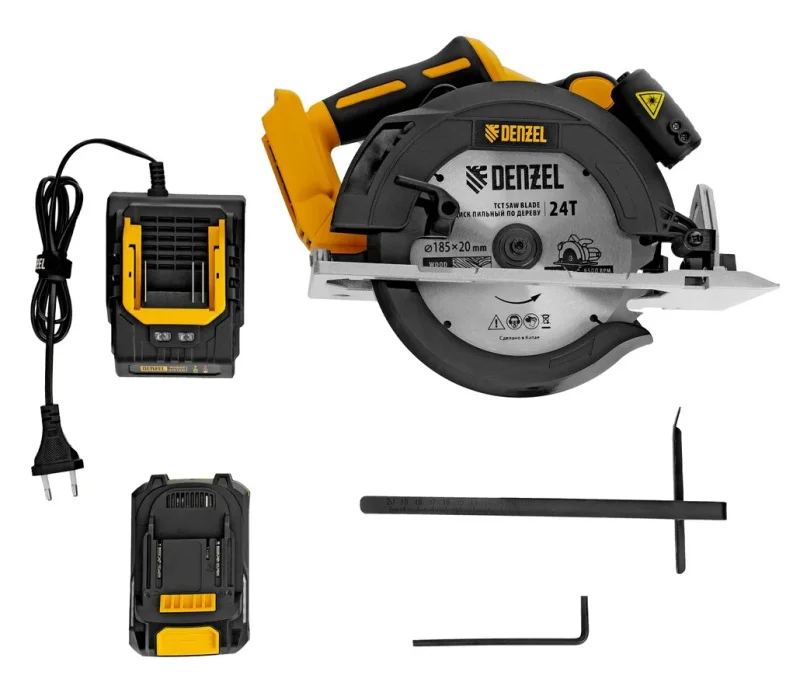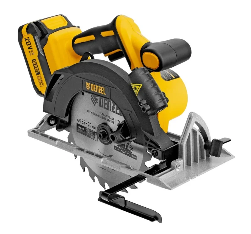 Циркулярная аккумуляторная пила Denzel CCSH-BL-20-185 27409 с бесщеточным двигателем работает от источника питания Li-Ion 20 В и предназначена для распиливания древесины при помощи пильных дисков диаметром 185 мм.
