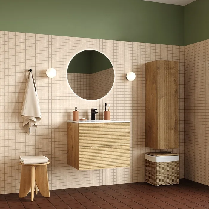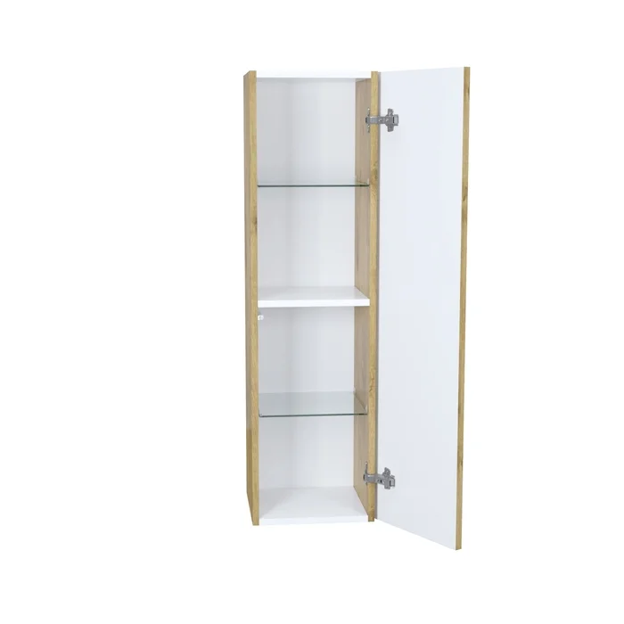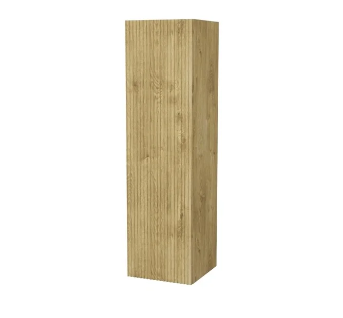 Подвесной пенал для ванной комнаты Bild – красивый дизайн со структурной вертикальной фрезеровкой в сочетании с теплым оттенком дуба, удобством и практичностью. Универсальная ориентация: пенал можно подвесить так, чтобы дверки открывались в удобную вам сторону (пенал можно перевернуть на 180 градусов, при этом перевешивать дверцы не нужно).