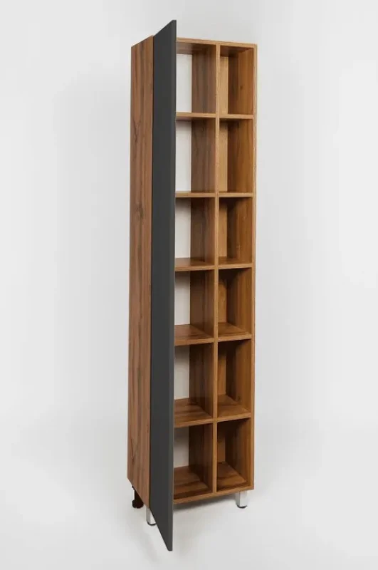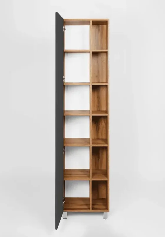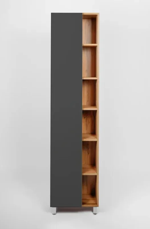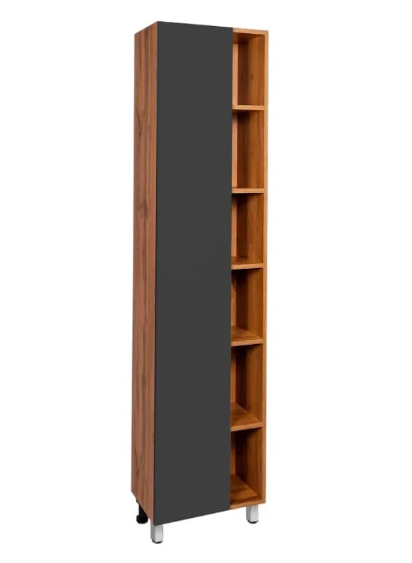 Шкаф пенал VIANT Бостон 45 VBOS450G-PEN станет идеальным решением для современной ванной комнаты. Этот напольный шкаф пенал выполнен в стильном дизайне, сочетающем графит матовый и древесный оттенок Дуб Вотан. Материалы высокого качества, такие как ЛДСП Lamarty и МДФ, обеспечивают долговечность и устойчивость к влаге, что важно для ванной.