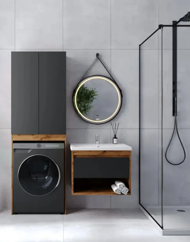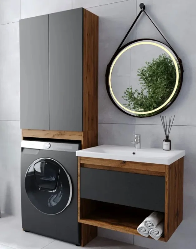 Шкаф пенал VIANT Бостон 65 VBOS645G-SHSM — идеальное решение для современной ванной комнаты. Этот напольный шкаф с местом для стиральной машины выполнен в стильном графитовом матовом цвете и оттенке дуб вотан. Его корпус из ЛДСП Lamarty и фасад из МДФ с матовой пленкой ПВХ обеспечивают долговечность и эстетичность.