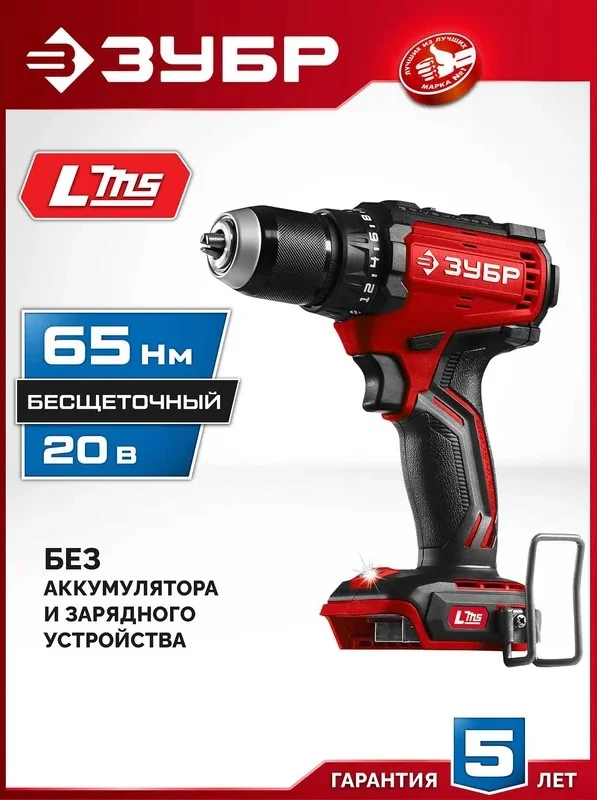 ЗУБР 20 В, 65 Н·м, без АКБ (LMS), бесщеточная дрель-шуруповерт ДБ-65 - бесщеточная дрель-шуруповерт ЗУБР системы LMS с увеличенным крутящим моментом предназначена для быстрого заворачивания саморезов до 8 мм диаметром и сверления отверстий до 30 мм в дереве. Длительная работа от одного заряда обеспечивается эффективным двигателем BRUSHLESS.