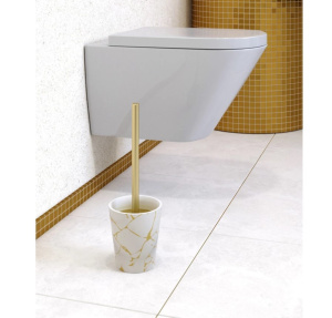 Изделие включает в себя ерш с пластиковой хромированной ручкой и подставку из полимерного материала (полирезина). Влагоустойчив. Щётка имеет густой жесткий ворс, обладает высокой стойкостью к стиранию. Ершик оснащен крышкой, что предотвращает попадание пыли и грязи на щетку. Имеет необычную цилиндрическую форму с золотистым мраморным рисунком. Стильный и элегантный дизайн подчеркивает современность интерьера и придает ванной комнате особый шарм. Размер (Г*Ш*В): 12*12*37 см