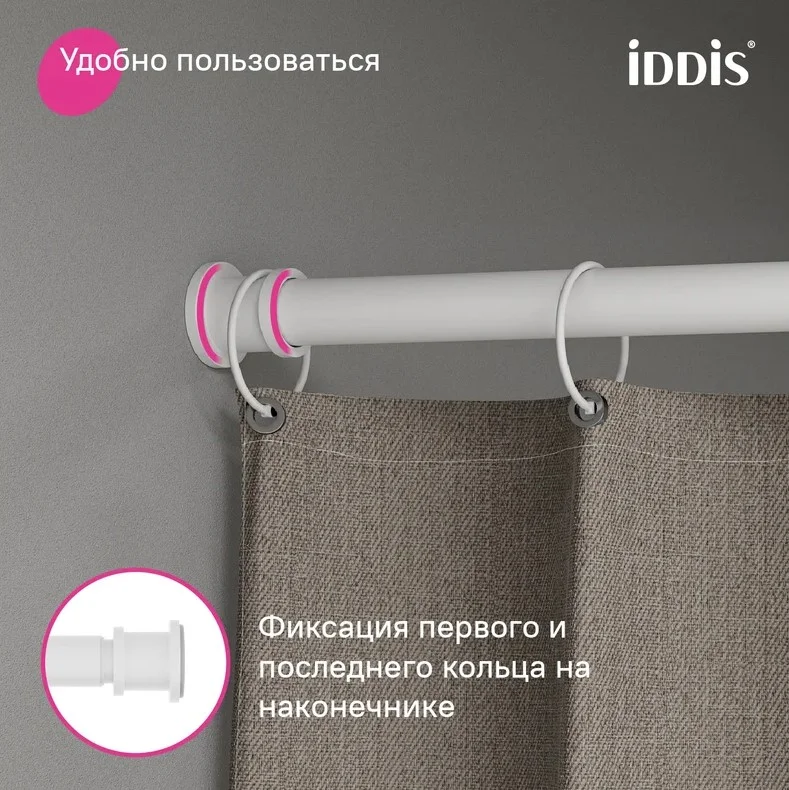 Карниз оснащен пластиковыми наконечниками с полиуретановыми прокладками, за счет которых не поцарапает стены в ванной и надежно зафиксируется между ними. Съемные наконечники карниза позволяют при желании сначала повесить штору, а затем установить карниз.