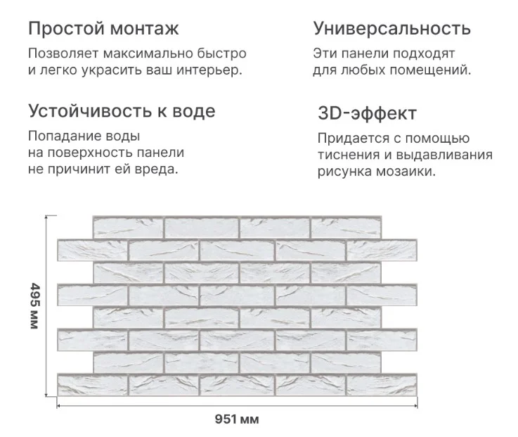 Панель изготовлена из ПВХ премиум качества, обладает 100% устойчивостью к влаге и перепадам температур. Дизайн позволяет создать иллюзию кирпичной декоративной стены, подчеркнуть индивидуальность интерьера. Подходит под стили: лофт и минимализм.