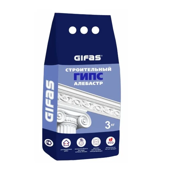 Гипс строительный Алебастр Gifas — это быстротвердеющий материал, применяемый в отделочных, ремонтных и интерьерных работах внутри помещений с нормальной влажностью. Растворы на основе гипса используют для крепления штукатурных маяков и уголков, а также для изготовления строительных изделий и лепнины. Перед использованием гипса убедитесь, что основание прочное, чистое от пыли, грязи, масел и битумных пятен, а также увлажнено водой или грунтовкой.