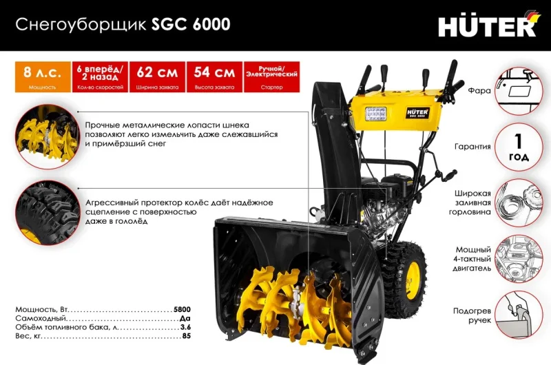 Рабочим органом модели Huter SGC 6000 является металлический шнек из высокопрочной стали, позволяющий захватывать и перемалывать попадающие куски обледенелого снега, наста и льда. Выброс осуществляется через желоб на 15 метров, причём дальность можно заранее настроить, а сторону выброса можно регулировать прямо во время движения. Модель снегоуборщика Huter SGC 6000 отличается хорошей манёвренностью и устойчивостью на скользкой поверхности благодаря паре колёс с глубоким «тракторным» протектором. Для удобства работы со снегоуборочной машиной имеется электростартер с питанием от сети 220 В, подогрев ручек и мощная фара.