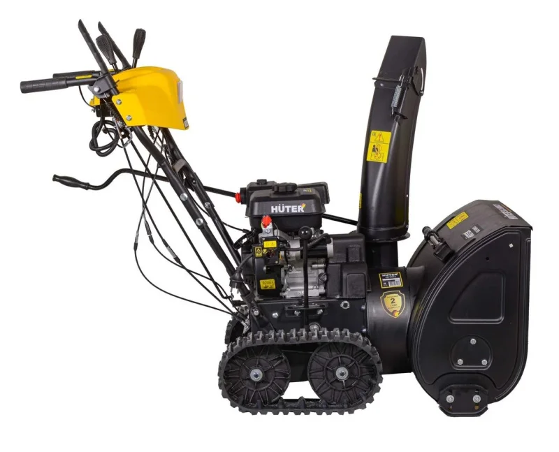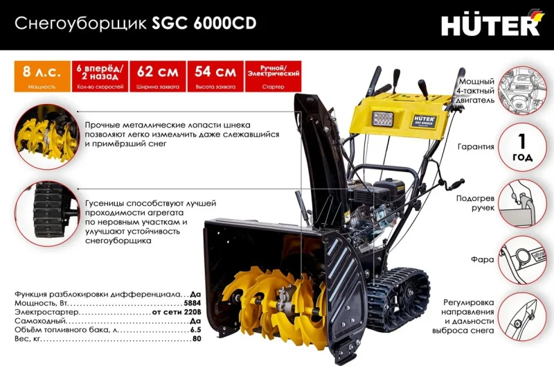 Снегоуборщик HUTER SGC 6000CD оснащен ручным и электрическим стартером от сети 220 В. Это создает условия для быстрого запуска при любой температуре окружающей среды. Функция разблокировки дифференциала позволяет более удобно разворачивать агрегат. Самоходная модель требует минимальных усилий со стороны оператора. Наличие фары и подогрев рукояток позволяет использовать снегоуборочную машину вне зависимости от погоды и времени суток. Ограничительные башмаки предусмотрены для регулировки высоты подъема ковша, защищают расчищаемую поверхность от повреждений.