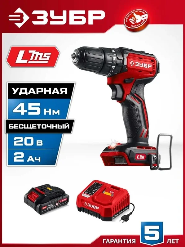 ЗУБР 20 В, 45 Н·м, 1 АКБ LMS (2 А·ч), бесщеточная ударная дрель-шуруповерт ДБУ-45-21 - инструмент из единой аккумуляторной системы LMS для 500+ инструментов.