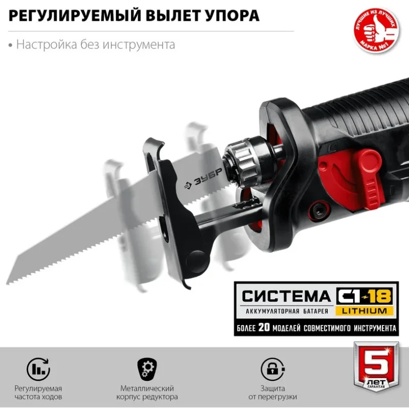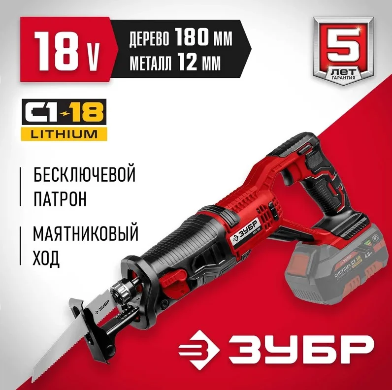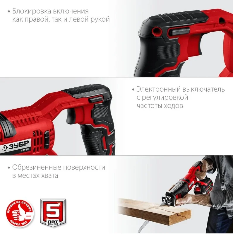Сабельная пила ЗУБР СПЛ-185 используется для продольного, поперечного, под углом и фигурного пиления заготовок из дерева, фанеры, ДСП, пластмасс, металла и пенобетона (при установке соответствующего полотна).