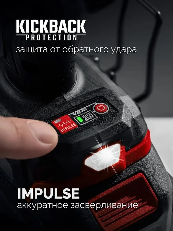 Встроенная отключаемая защита от обратного удара контролирует рывки инструмента и выключает двигатель, предотвращая травмы оператора