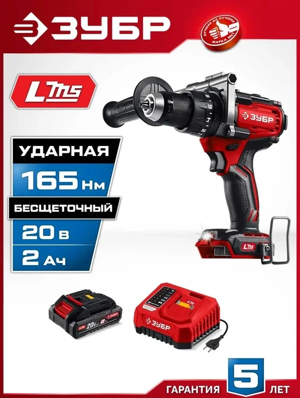 ЗУБР 20 В, 165 Н·м, 1 АКБ LMS (2 А·ч), бесщеточная ударная дрель-шуруповерт ДБУ-165-21 - бесщеточная ударная дрель-шуруповерт ЗУБР системы LMS с увеличенным крутящим моментом предназначена для быстрого заворачивания саморезов до 12 мм диаметром и сверления отверстий до 40 мм в дереве. Длительная работа от одного заряда обеспечивается эффективным двигателем BRUSHLESS. Расширенная функциональность за счет ударного режима работы. Комплектация с аккумулятором позволяет начать работу сразу после покупки.