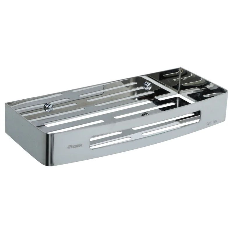 Хромоникелевое покрытие придает изделию безупречный глянцевый блеск и долговечность. Аксессуар надежно фиксируется к стене при помощи набора креплений и служит отличным местом для хранения шампуней и гелей для душа. Полка подходит для эксплуатации в отелях, ресторанах и других общественных местах.