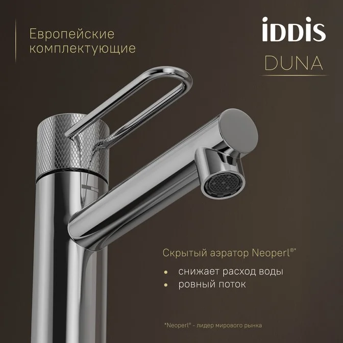 — Скрытый аэратор Neoperl® (Швейцария) не нарушает дизайн, формирует ровный поток и снижает расход воды. Ключ для обслуживания в комплекте.