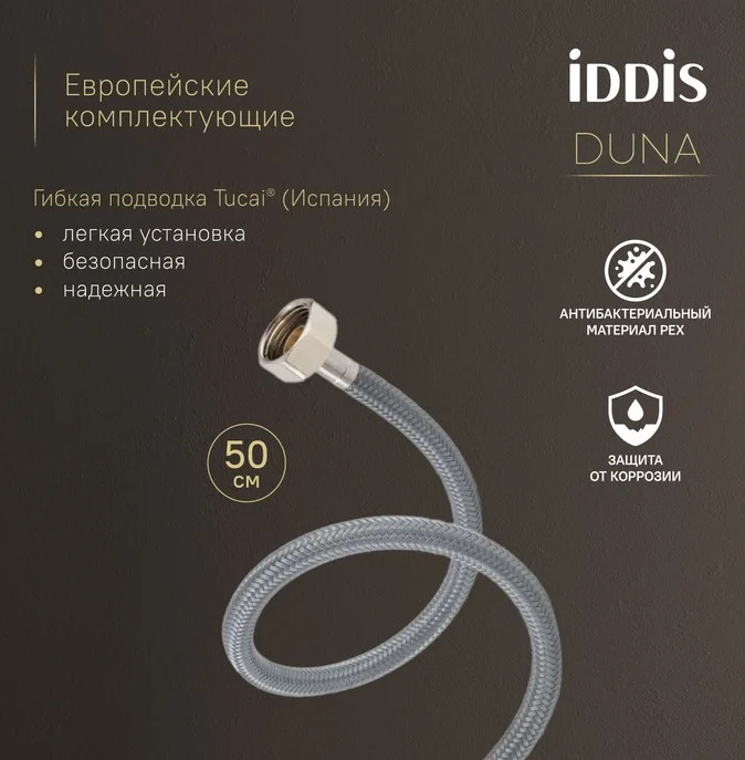 — Гибкая подводка Tucai® (Испания): безопасна для здоровья благодаря шлангу из нетоксичного материала PEX с антибактериальным эффектом, нейлоновая оплетка для защиты от коррозии и износа, увеличенная длина 50 см упрощает монтаж.