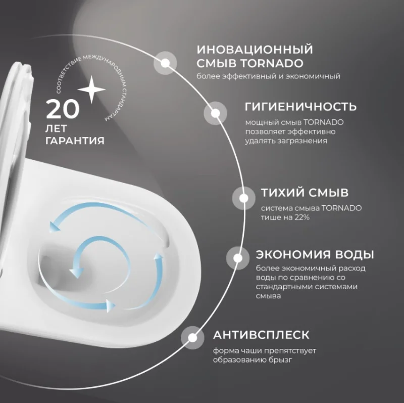 выполнен из белого фарфора, который обжигается при температуре свыше 1000° С, что делает его невероятно прочным и долговечным. Система смыва смыв торнадо