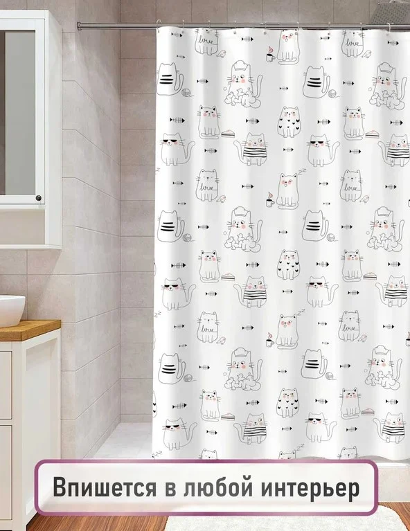 Шторка для ванной комнаты CATS - идеальное сочетание стиля и качества. Изделие с оригинальным принтом оценят любители молодежных неординарных решений в дизайне интерьера.