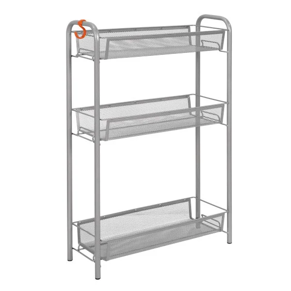 Сборно-разборная конструкция, сборка без инструментов, три удобных корзины, увеличенное расстояние между нижними корзинами для высоких предметов, пластиковый крючок для мелочей, допустимая нагрузка до 10 кг на корзину.