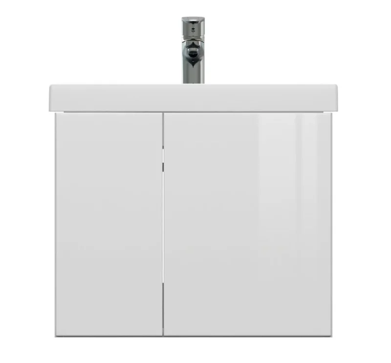 Белые глянцевые фасады, четкие геометрические формы тумбы помогут создать минималистичный и строгий интерьер ванной комнаты.