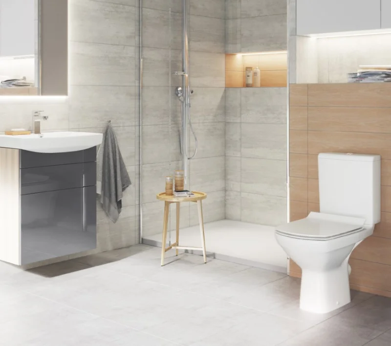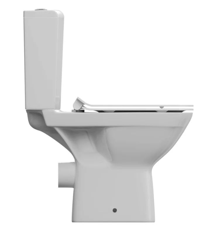 Безободковый напольный унитаз-компакт с ультратонким, антибактериальным сиденьем с плавным закрыванием и легкосъемным механизмом.
