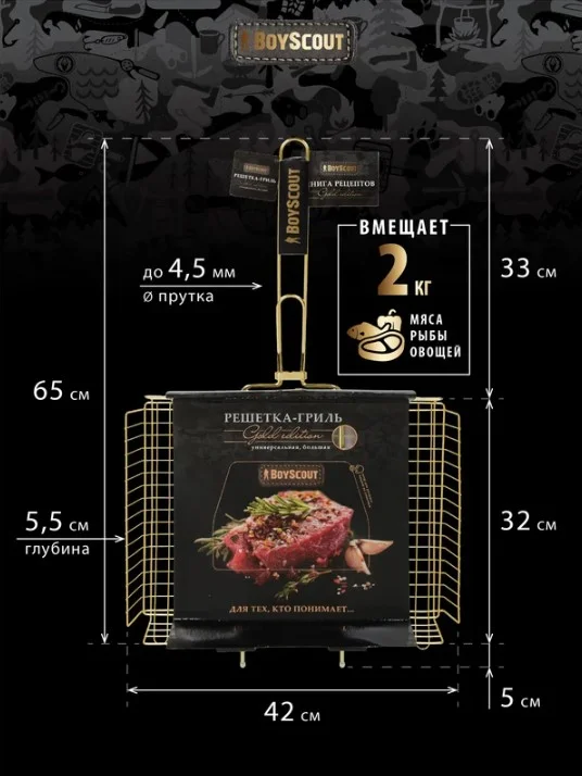 Универсальная решетка-гриль BOYSCOUT, большая GOLD 61909 предназначена для приготовления мяса и овощей на природе.