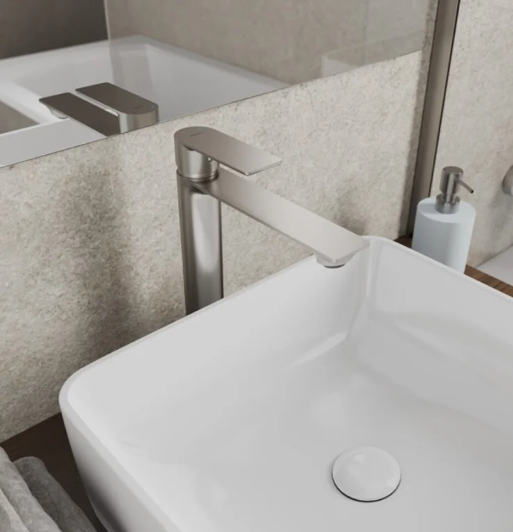 Четкие линии излива гармонично сочетаются с мебелью разных стилей и умывальниками популярных форм: с плавными или угловатыми линиями.