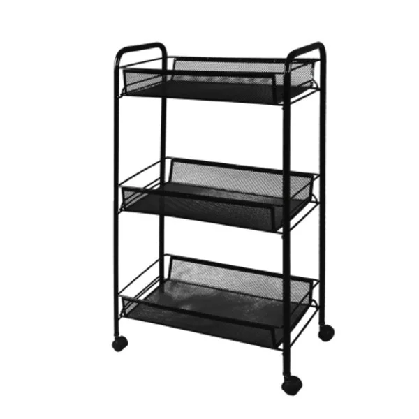 Сборно-разборная конструкция, три удобных корзины. Допустимая нагрузка до 10 кг на корзину. Пластиковый крючок для мелочей. Пластиковые колёса. Расстояние между корзинами 270 мм. В собранном виде 440*250*735 мм. Размер корзины: 410*250*62 мм