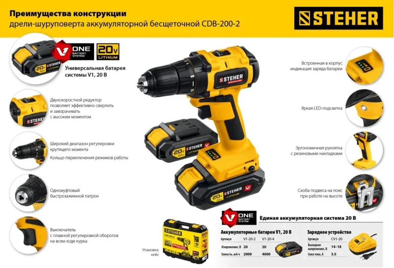 Два аккумулятора в комплекте STEHER CDB-200-2 – для продолжительных работ без простоев