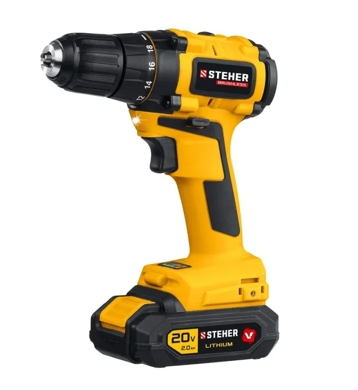 Бесщеточная дрель-шуруповерт STEHER CDB-200-2 используется для сверления отверстий в различных материалах (при установке сверла), а также для вкручивания и выкручивания шурупов, саморезов и винтов (при установке соответствующих бит).