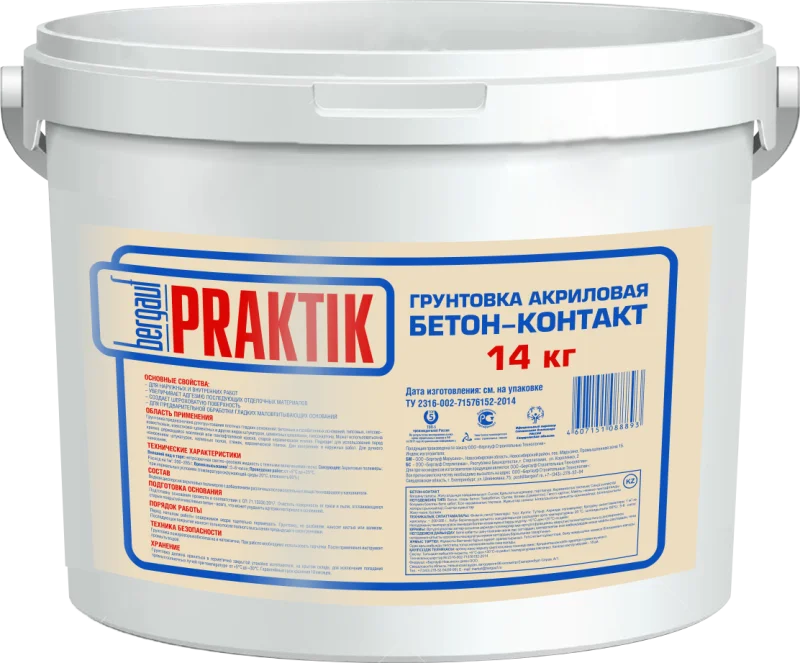 Грунтовка бетон контакт всесезонная Praktik Bergauf применяется при подготовке гладких оснований внутри и снаружи помещений с различным влажностным режимом. Она применяется для оштукатуривания, шпаклевания, обустройства стяжки и наклейки кафельной плитки. Эта грунтовка эффективна для образования шероховатой поверхности и улучшения сцепления финишного покрытия с основанием. Грунтовка быстро сохнет и подходит для гладких и непоглощающих оснований, устойчива к воздействию щелочей, может использоваться для внутренних и наружных работ, а также подходит для сухих и влажных помещений.