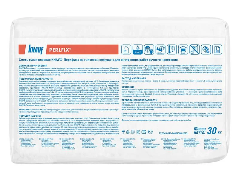 Основание должно быть сухим с температурой не ниже + 5°С. Поверхность очистить от грязи, пыли и отслоений, если нужно промыть, с бетона удалить остатки опалубочной смазки. Устранить выступы. Сильно впитывающие влагу поверхности, например, силикатный и керамический кирпич, газобетон, штукатурки, грунтуются с помощью кисти, валика или распылителя грунтовкой КНАУФ Грундирмиттель. Плотные, не впитывающие влагу поверхности, например, бетон, пенобетон, обрабатываются грунтовкой КНАУФ Бетоконтакт, для улучшения адгезии (сцепления) раствора монтажной смеси с поверхностью стены. После нанесения дать грунтовке высохнуть. Не допускать запыления загрунтованной поверхности. Температура в помещении при проведении работ должна быть не менее +5°С. Работы по приклеиванию ГКЛ и ГКП следует проводить при эксплуатационном температурно-влажностном режиме, после завершения всех работ, связанных с его изменением, что исключает линейные деформации гипсокартонных листов и комбинированных панелей. Например, если в помещении предусматривается устройство наливного пола или выравнивающей стяжки, то приклеивание ГКЛ и ГКП следует проводить после завершения этих работ. Приготовление монтажного раствора В пластмассовый бак, залить чистую воду, из расчета 15-16 л на один мешок (30 кг), засыпать сухую смесь КНАУФ Перлфикс и перемешать миксером до получения однородной, не содержащей комков, кашицеобразной массы. При необходимости добавить воды или сухой смеси и опять перемешать. Не допускается добавлять в раствор другие компоненты! Продолжительность работы с раствором монтажной смеси ~ 30 минут. Загрязненные емкости и инструменты способствуют сокращению продолжительности применения материала.
