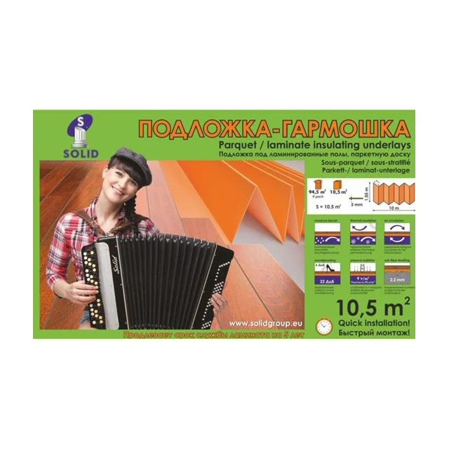 Подложка к ламинату ТМ Солид — это важный элемент укладки ламинатного покрытия, который не только улучшает технические характеристики напольного материала, но и продлевает срок его службы. Подложка от ТМ Солид разработана с учетом всех современных требований и возможностей, обеспечивая высокий уровень звукоизоляции и тепловой защиты вашего помещения.